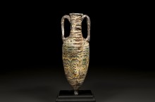 The smooth sides of this terracotta amphora remain in excellent condition, while the bichrome bands are still crisp and distinctly colored.