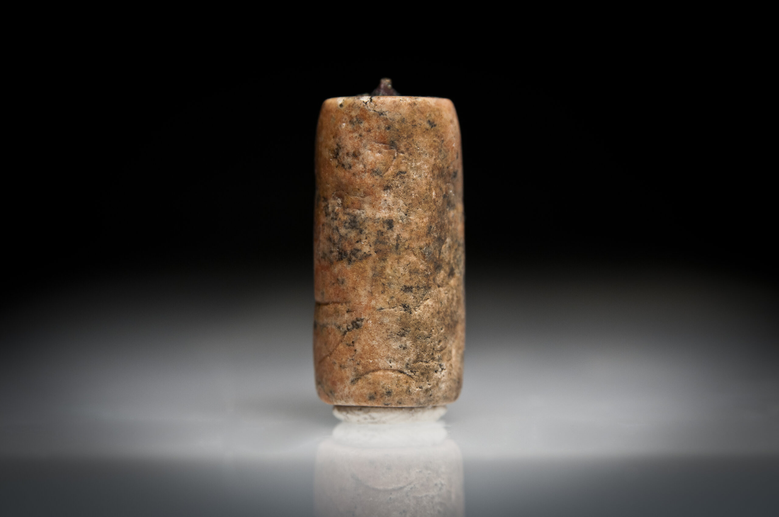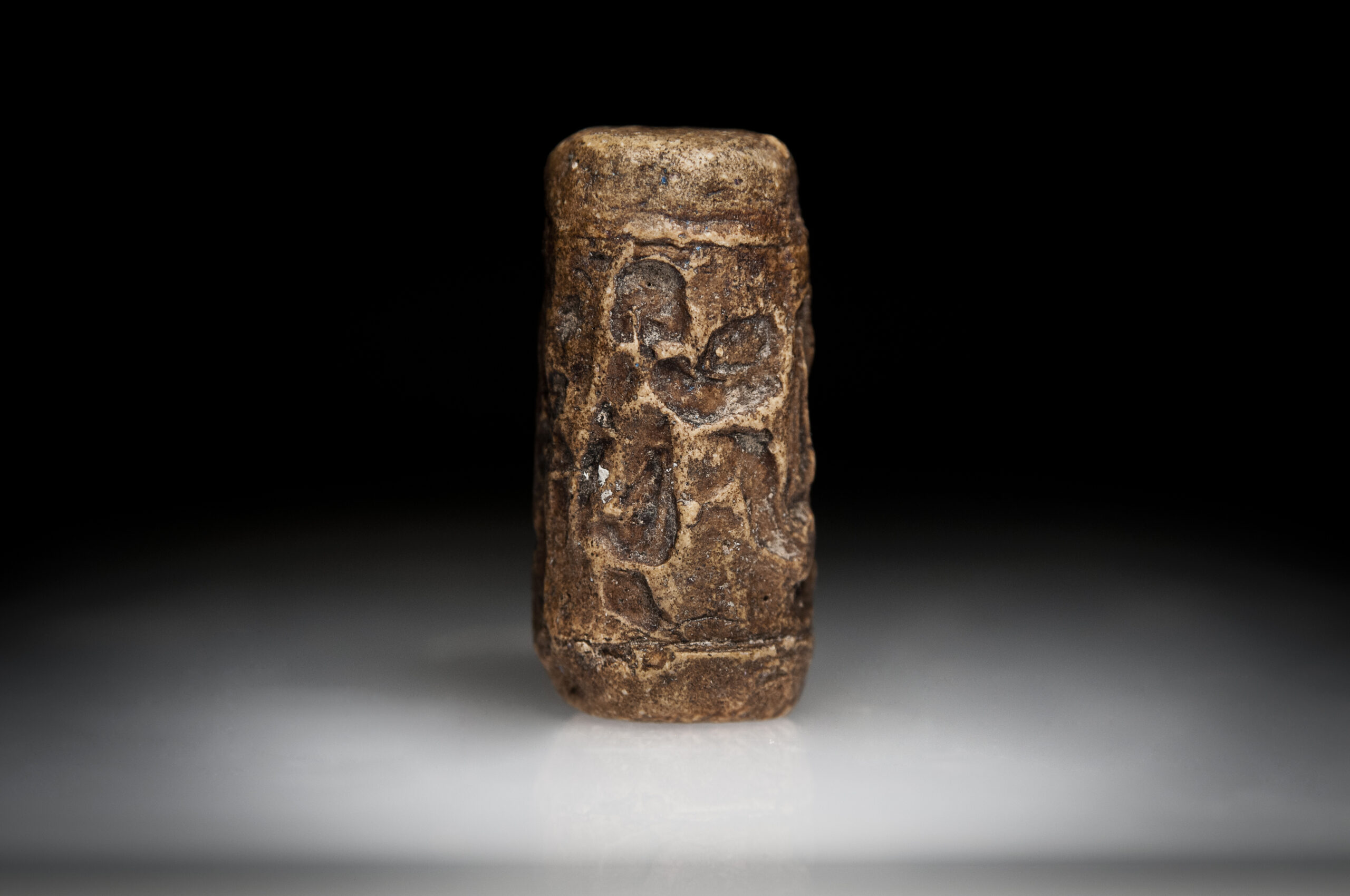 A Neo Sumerian Limestone Cylinder Seal Engraved with a Drinking Scene
