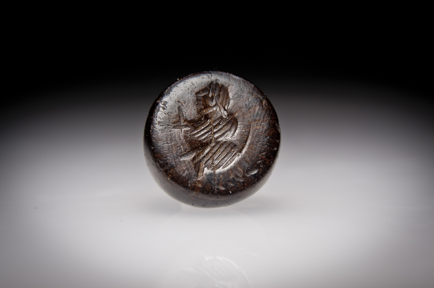 A Hematite Persian Stamp Seal with a Standing Figure in Front of a Palm