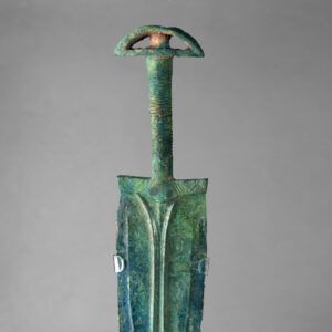 This bronze helmet is designed for combat rather than purely ceremonial purposes, with blade-like wings which slide forward under the jawline from a straight-edge forehead margin. The top of the helmet is fortified with two prominent structural ‘ribs’ designed to deflect sword blows, while the rear edge of the helmet – above the shoulders – is lipped outwards to provide a neck guard. There are faint marks indicating that the helmet was indeed struck, probably by a sword, on the left side.