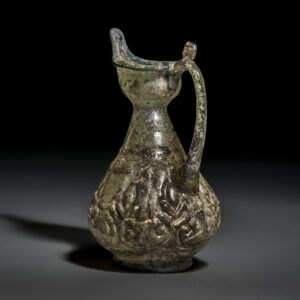 An elegant Islamic glass bottle with a pointy rim, a single handle, and decorated with a leaf motif around the body