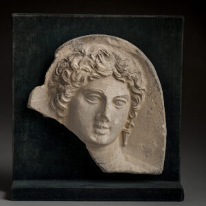 A beautiful reddish tone Antefixes,  an antefix is a decorative brick used on buildings. This semi- oval relief was made from a mold. The illustration shows a bust of a young woman looking to her right. The face is sunken by both Eyes to emphasize them with shaped bold eyelids. The pupils are incised; the protruding nose and the pair of lips are slightly worn. The head is framed by a powerful hairstyle, with hair parted in the center, and with numerous curls to the sides and some combed back . The woman is wearing a Cross and pyramidal earrings. The relief is mounted on a base with velvet .