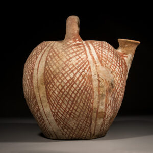 This round Canaanite jug is covered in a series of frenzied red lines that seem to buzz through time, the intersecting spaces broken up by a clearing of just three vertical marks at four spots along the jug’s body. The jug’s basket handle arches above the mouth’s large opening, while a short spout arises from the front, flaring slightly for an easy pour.