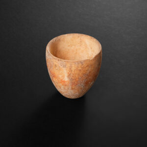 Alabaster cup from the Israelite kingdom period, dating to the time of King David, circa 1200–800 BC. This vessel has been carefully fashioned from fine, translucent alabaster, which remains in perfect condition, emphasizing the skill of its ancient maker. The cup measures approximately 6 cm in height and features a simple, elegant form with a rounded bowl and a narrow, slightly flared lip.