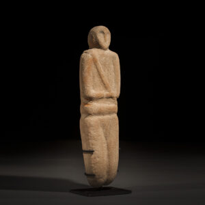 Pink statuette of Sabaean idol with stylized representation for the eyes and nose set on an oval face. Rectangular body is marked by diagonal sash running along torso. Arms are folded at right angles from the shoulders, set above belted waist and smooth legs.