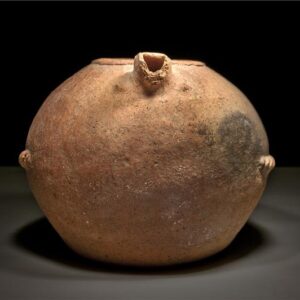The smooth sides of this terracotta amphora remain in excellent condition, while the bichrome bands are still crisp and distinctly colored.