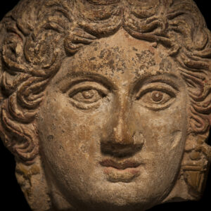 This terracotta piece shows a monster seated on its haunches and in profile, with its head turned to the right toward the public. The female countenance has idealised features of great beauty. The thick, wavy hair is crowned with a polos or crown on the Corinthian model. On the right wing the rendering of the feathers shows a clear interest in the anatomical details of birds: the feathers inserted into the body itself are small and short, rather like scales, while those at the extreme end of the wing are long and narrow, to help the bird take flight.