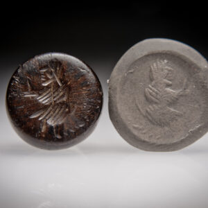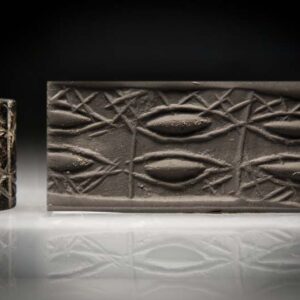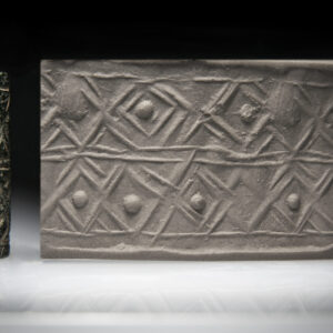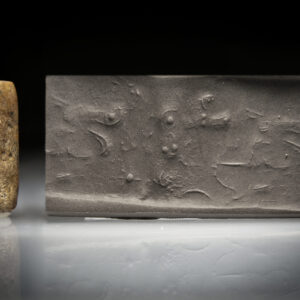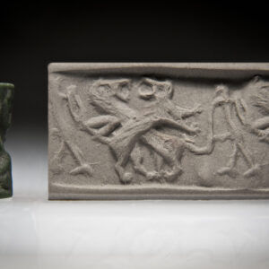 Akkadian Green Serpentine Cylinder Seal with a Figure and Two Fighting Lion