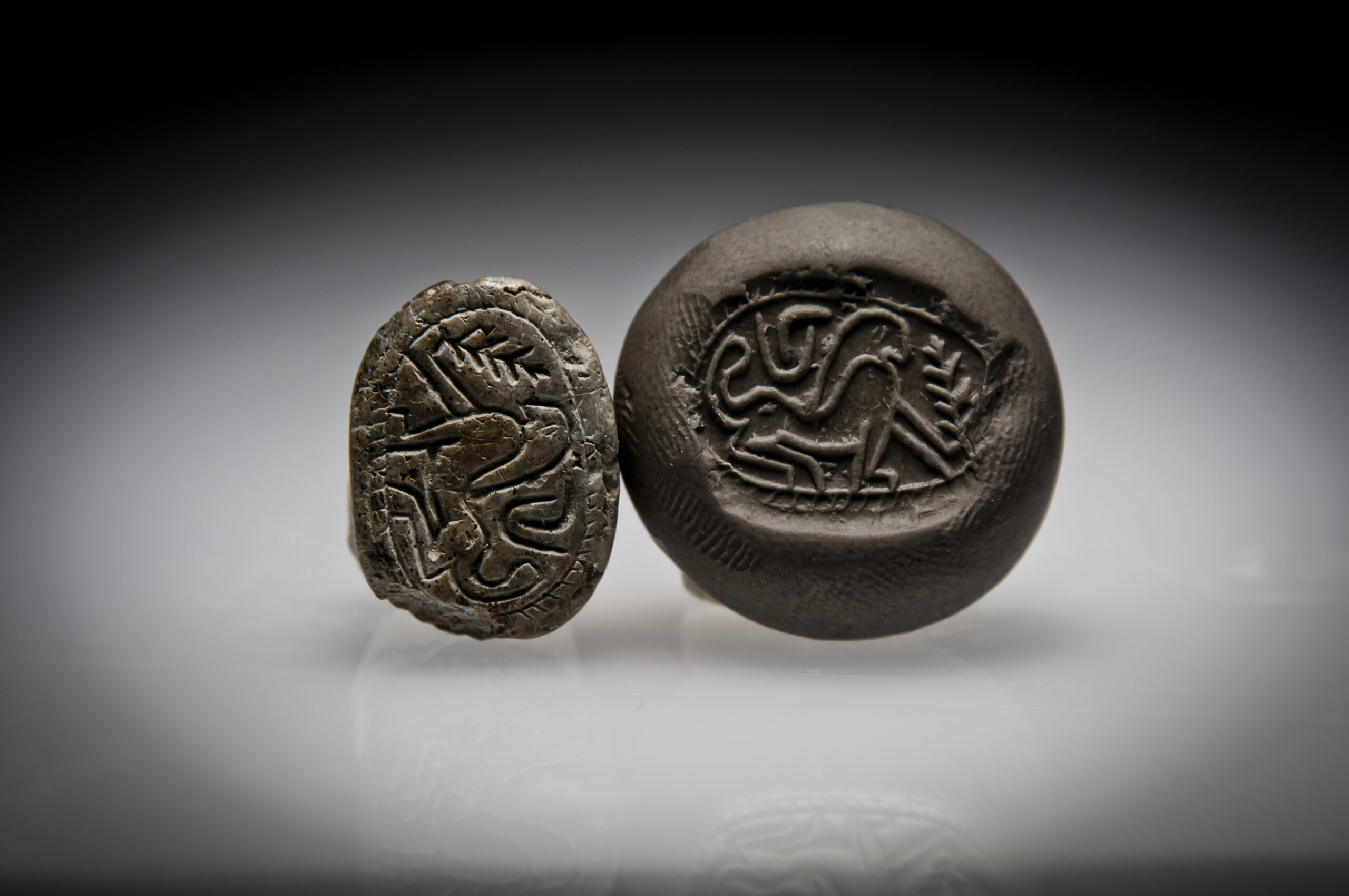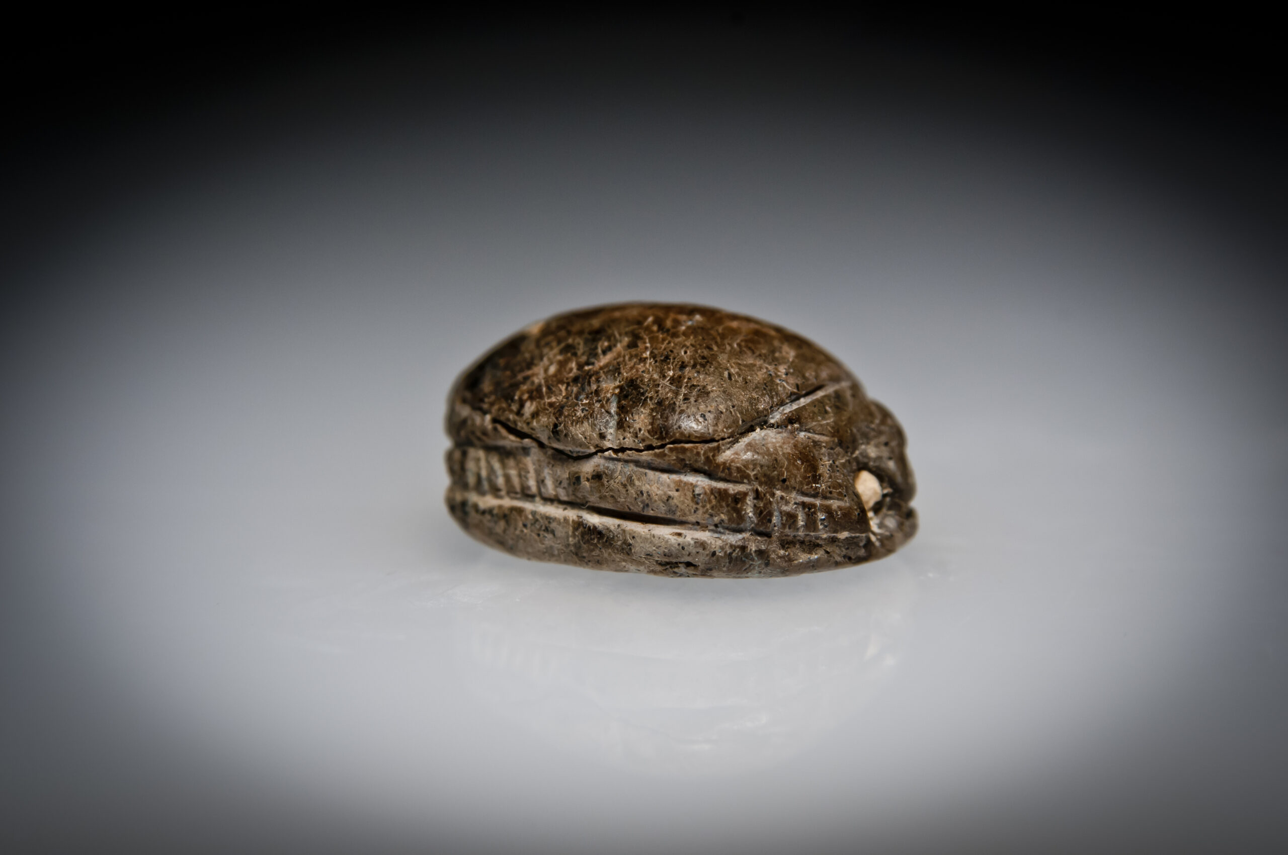 A Hyksos Steatite Scarab Engraved with a Sphinx with a Cobra above it, and a Palm Branch in Front