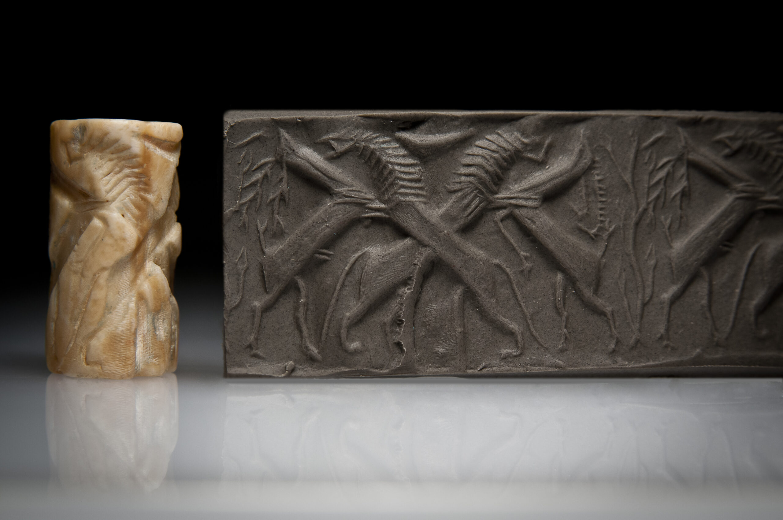 An Akkadian Plagioclase Cylinder Seal with Two Lions Attacking Two Deer