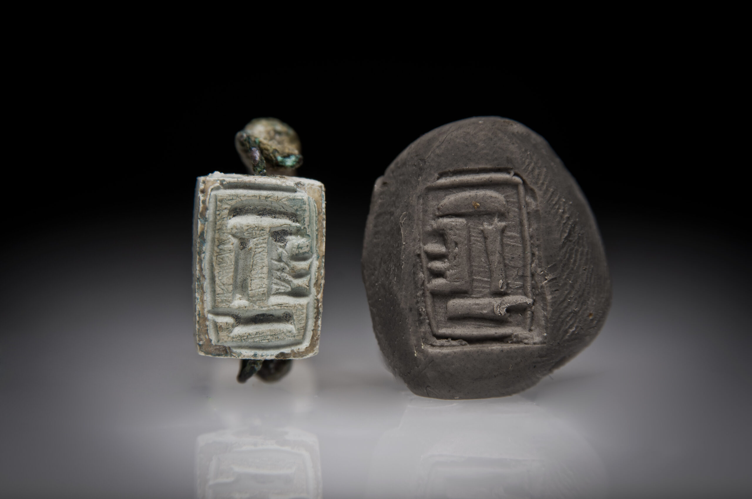An Egyptian Steatite Double sided Stamp Seal with a Hieroglyph and a Two Deities