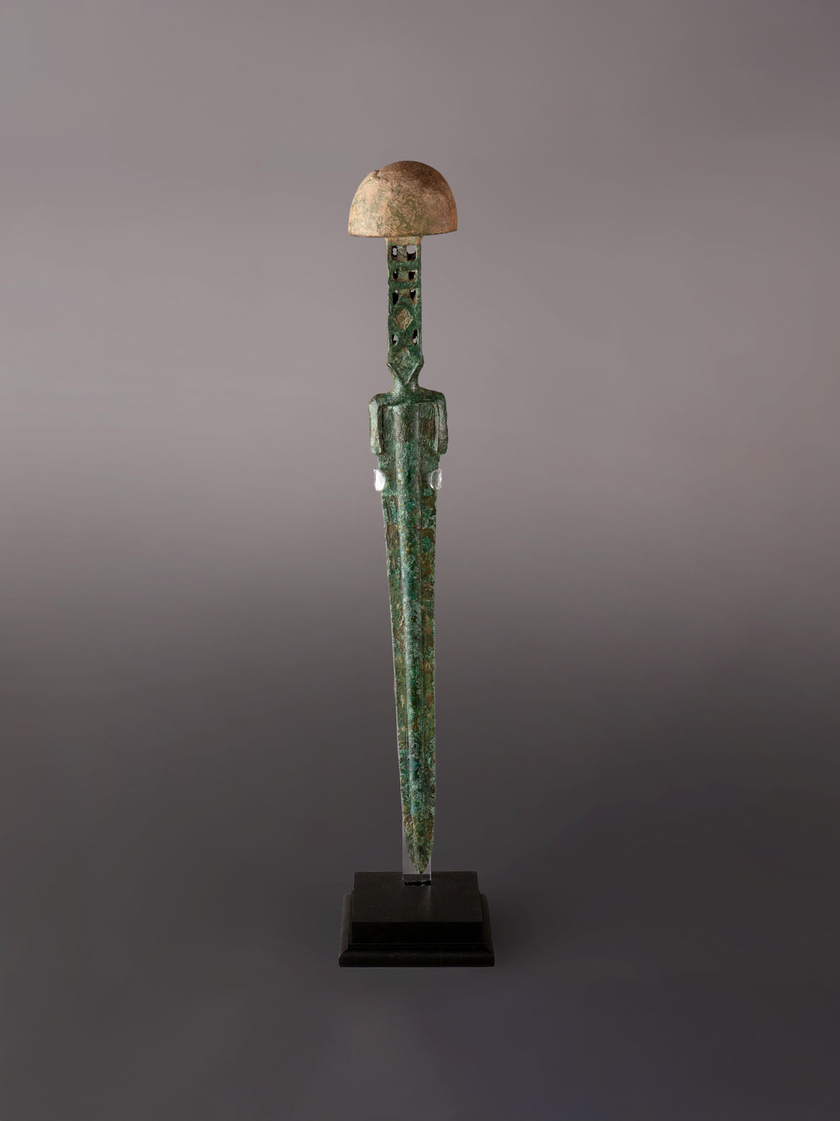 A Western Asiatic bronze Thrusting sword with a long, tapering blade, a prominent large polygonal mid-rib while gracefully curved. The hilt is characterized with a flat openwork cross-section and the dagger culminates in a distinctive, heavy pommel.