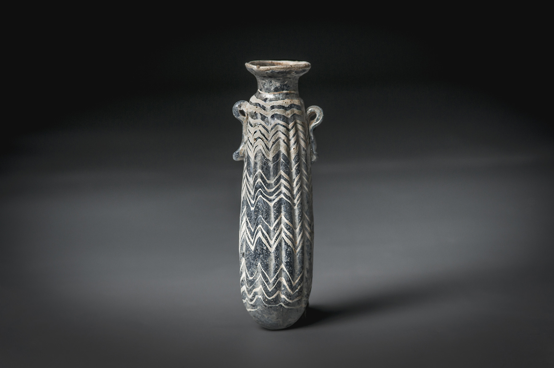 In translucent mid blue glass, with opaque cream trailed zigzag pattern. The vessel has an everted rim edged in cream, a short neck and a long tubular ribbed body widening slightly to the rounded base. Two handles in blue are applied to the shoulders.