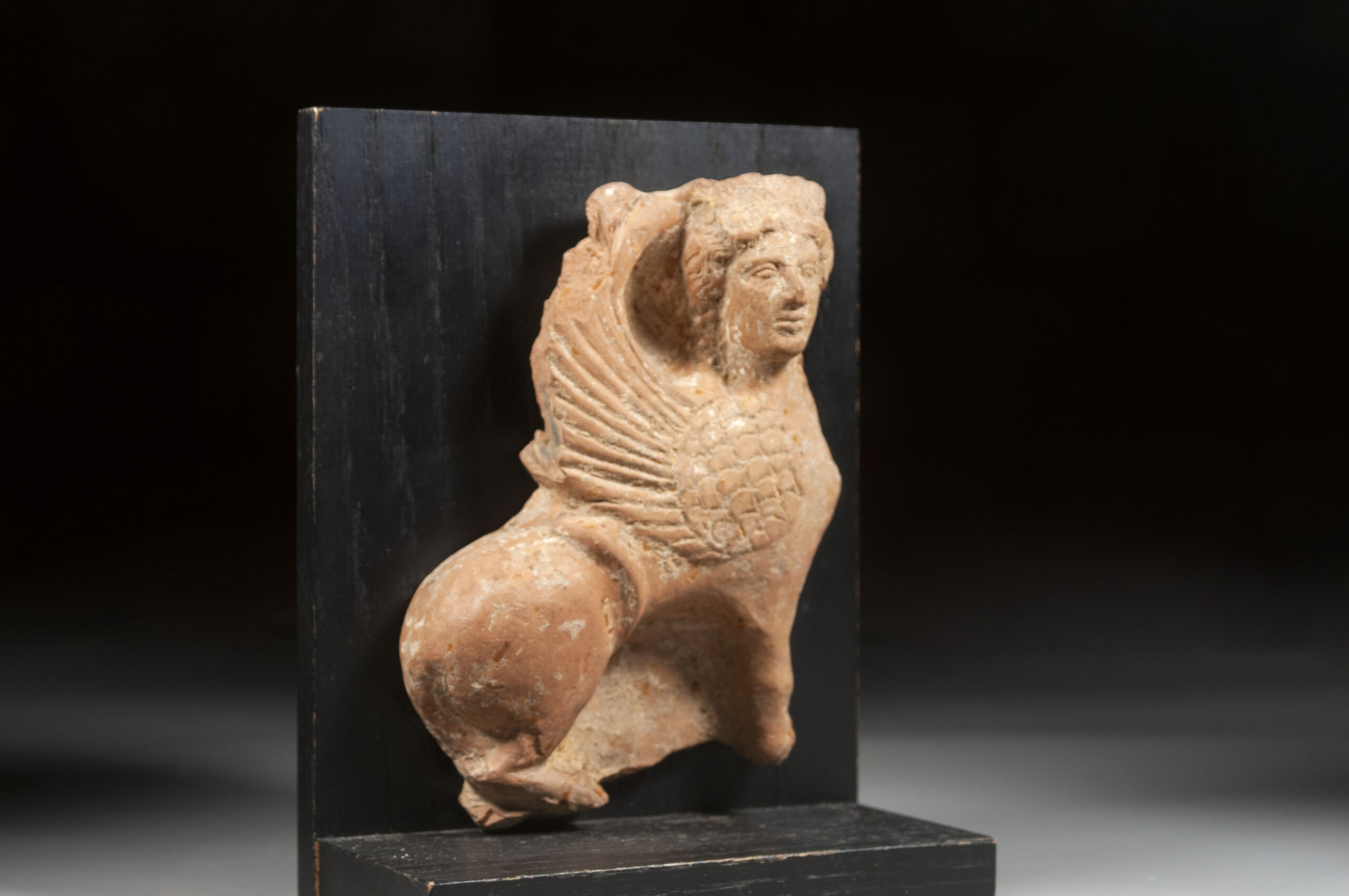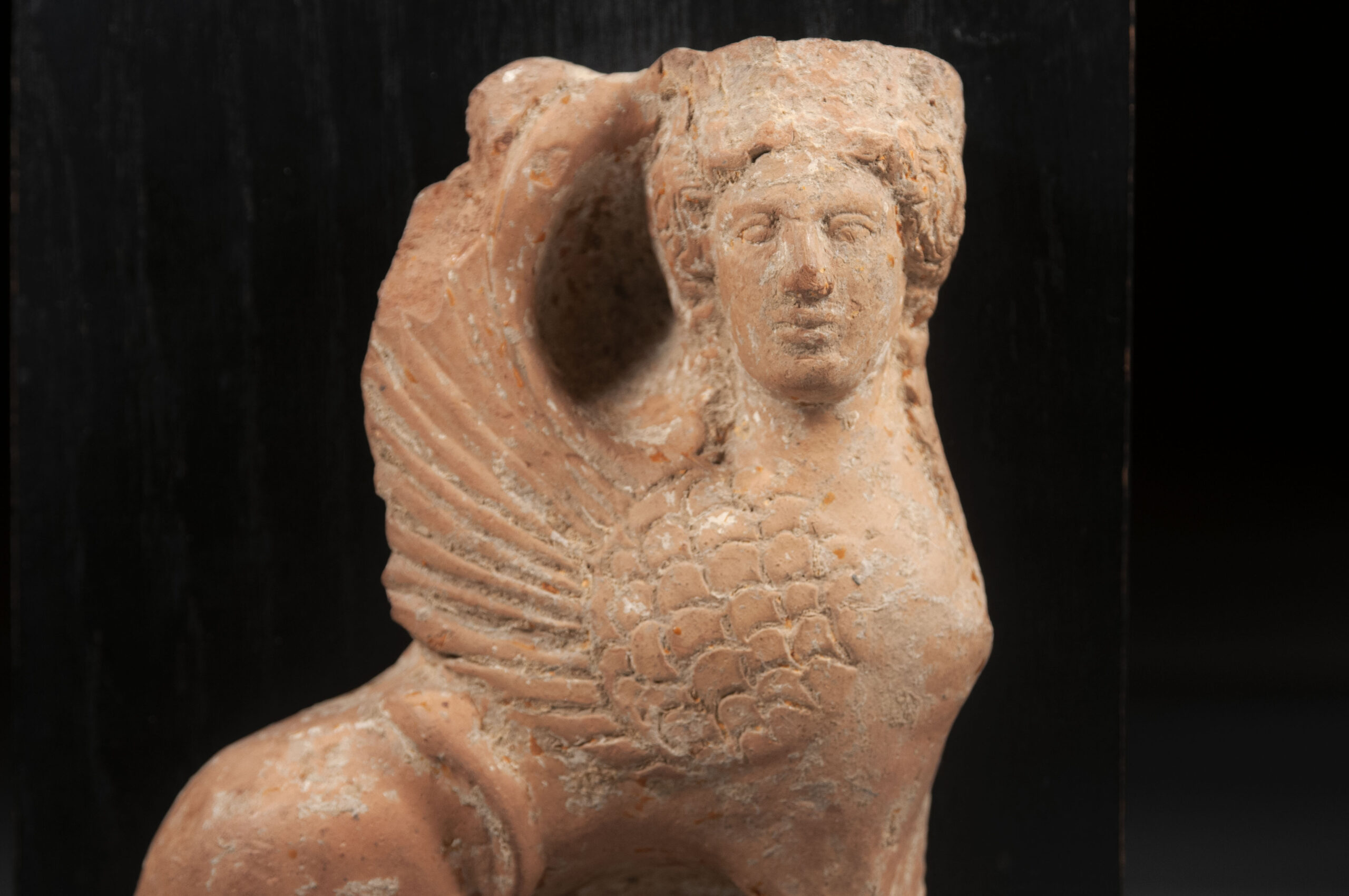 This terracotta piece shows a monster seated on its haunches and in profile, with its head turned to the right toward the public. The female countenance has idealised features of great beauty. The thick, wavy hair is crowned with a polos or crown on the Corinthian model. On the right wing the rendering of the feathers shows a clear interest in the anatomical details of birds: the feathers inserted into the body itself are small and short, rather like scales, while those at the extreme end of the wing are long and narrow, to help the bird take flight.