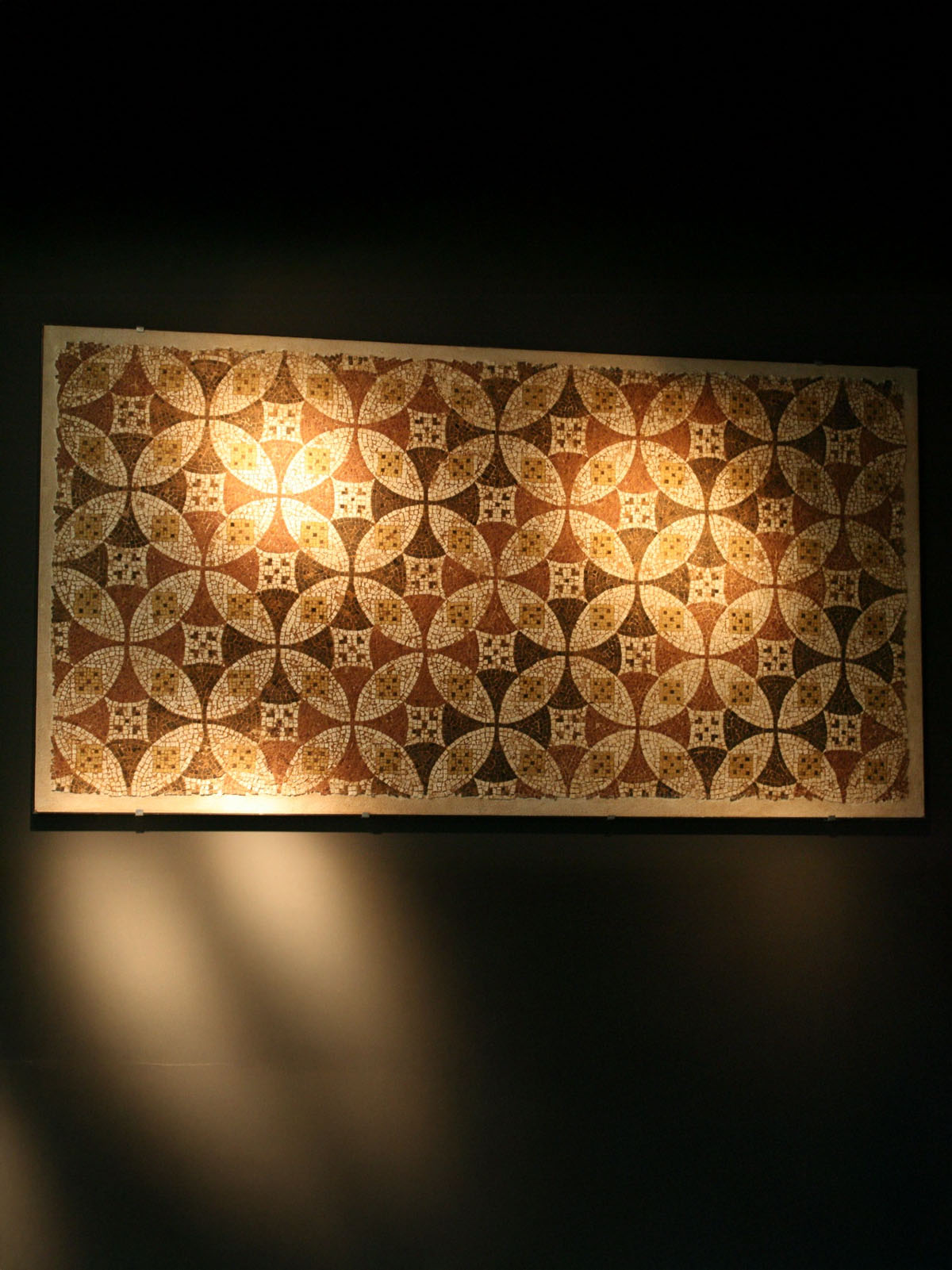 A mosaic depicting circles and diamonds forming interlocking crosses.