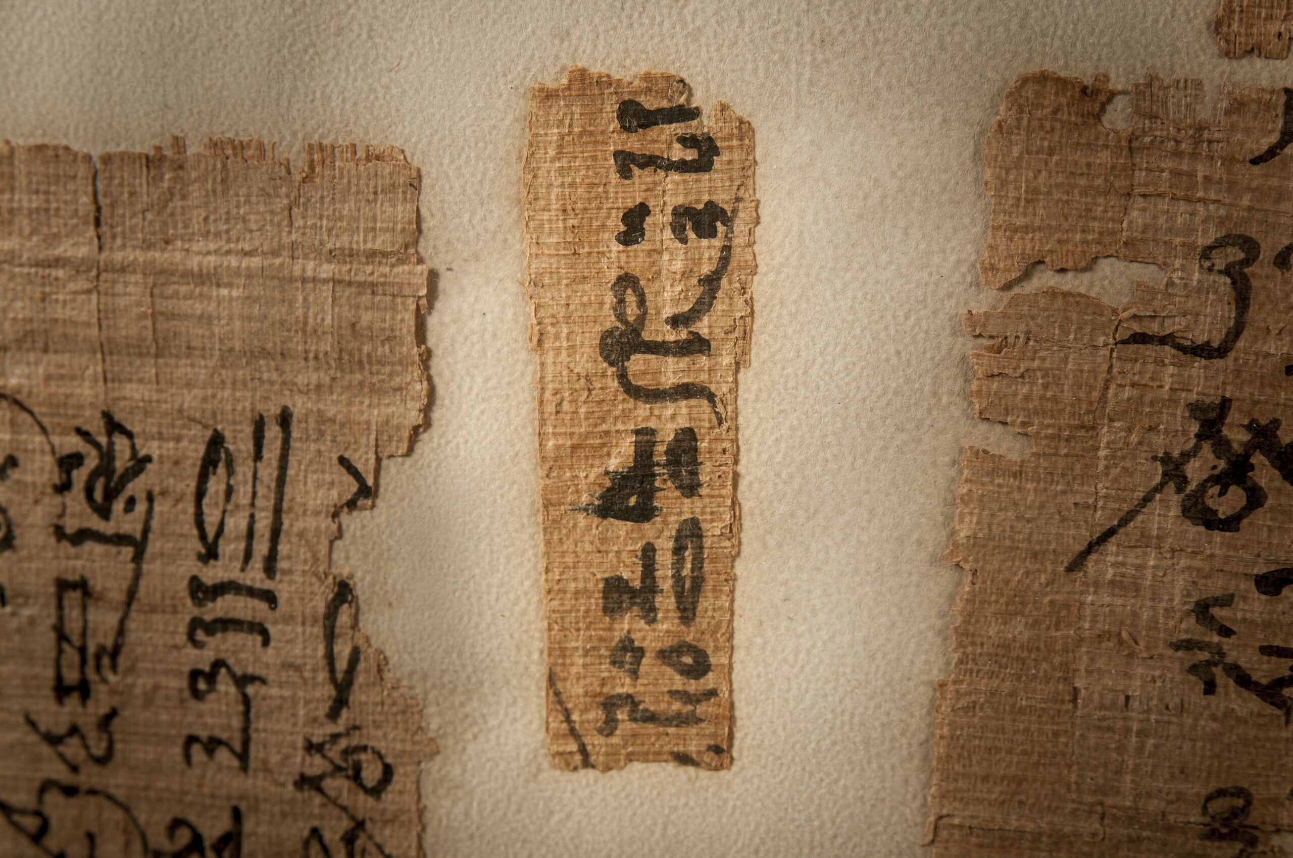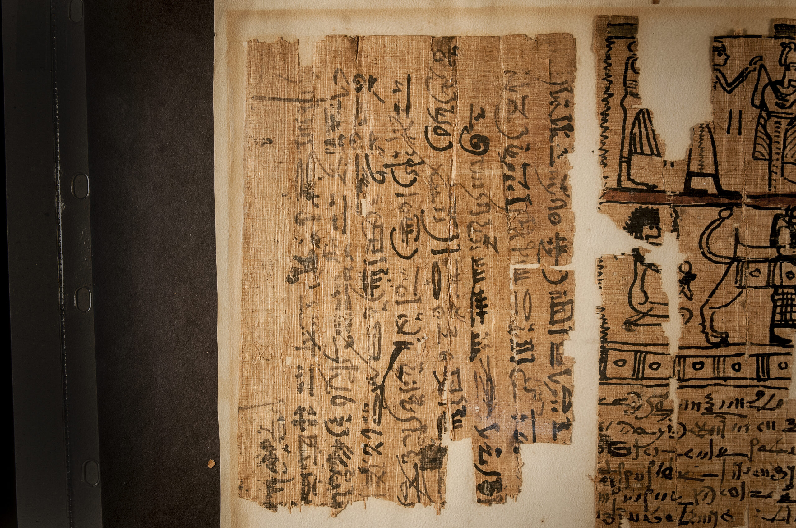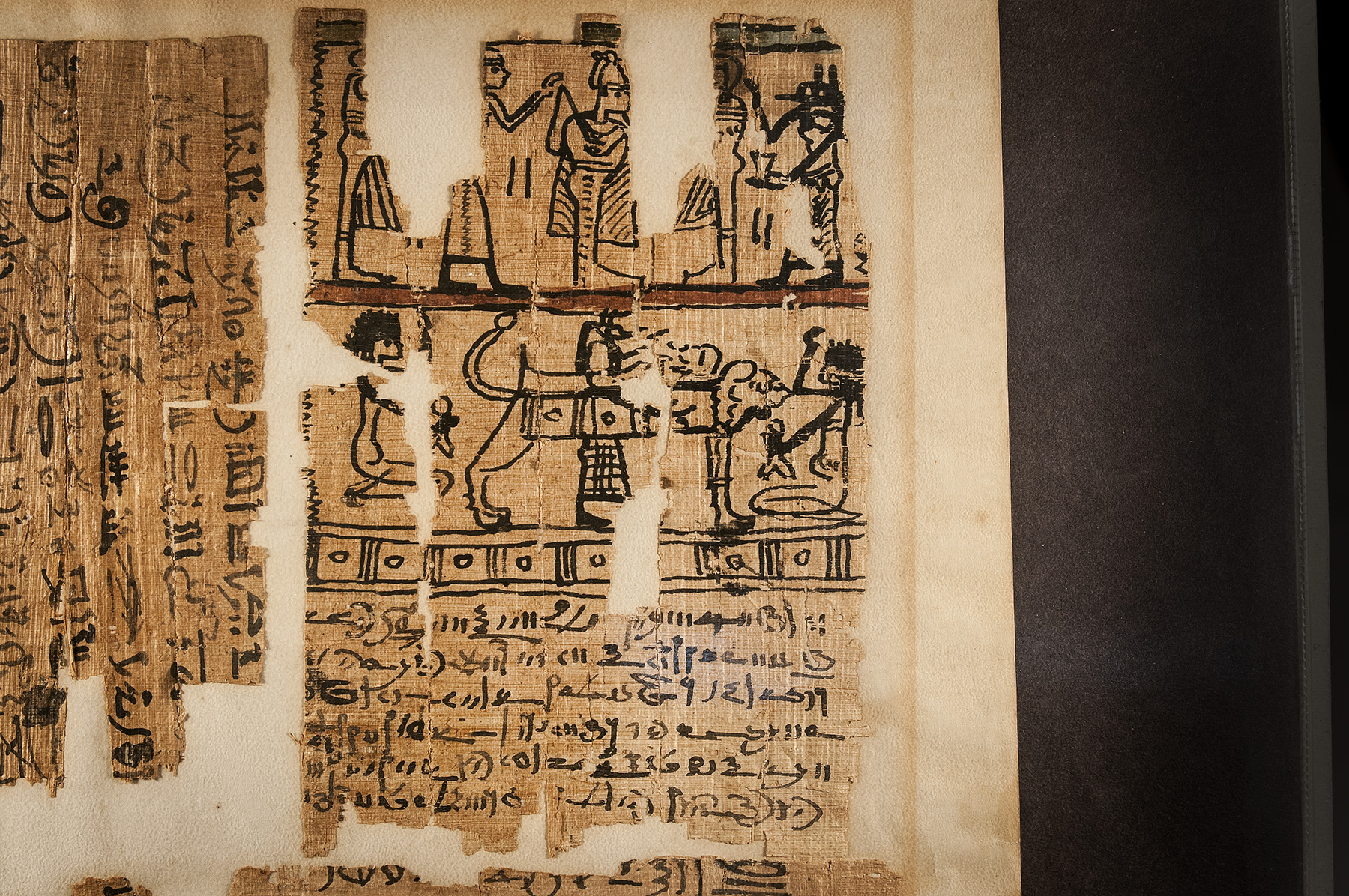 Featured here are several papyrus fragments of the Egyptian Book of the Dead from Egypt’s Ptolemaic Era (305 – 30 BCE). Examining Egyptian art during these 300 years reveals strong continuities in its traditions but also interactions with Greek art, whose forms and styles swept the world with Alexander’s armies. The encounter of the two cultures had many aspects and phases, and is easiest to comprehend by looking first at the new ruling class, its involvements and concerns, and then at religion and the arts in the greater land of Egypt.