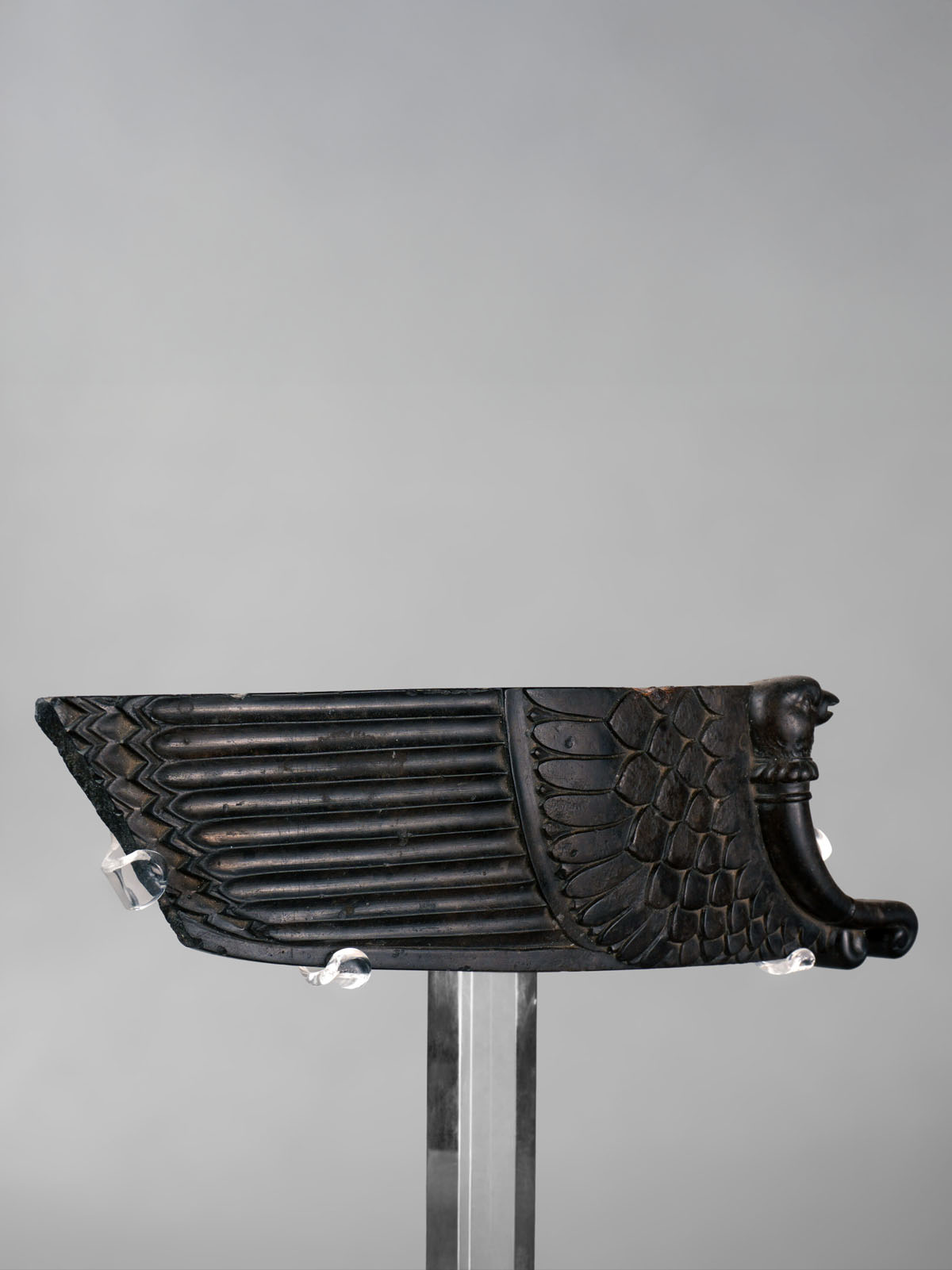 This schist wing, dating from the Achaemenid period circa 500–300 BC and measuring approximately 27.5 centimeters, exemplifies the sophisticated craftsmanship and symbolic motifs of the era. The carved stone fragment depicts a stylized wing, notable for its intricate workmanship and symbolic significance. Central to the design is a finely incised and carefully modeled relief of a phoenix, a mythological bird emblematic of renewal, immortality, and divine protection—an iconic motif in Persian art. The detailed depiction demonstrates the skillful use of incisions and relief carving, highlighting the artisans’ mastery of stonework.