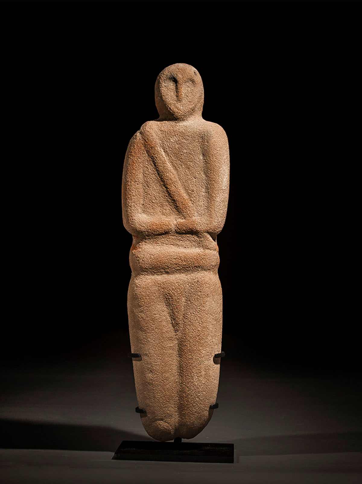 Pink statuette of Sabaean idol with stylized representation for the eyes and nose set on an oval face. Rectangular body is marked by diagonal sash running along torso. Arms are folded at right angles from the shoulders, set above belted waist and smooth legs.