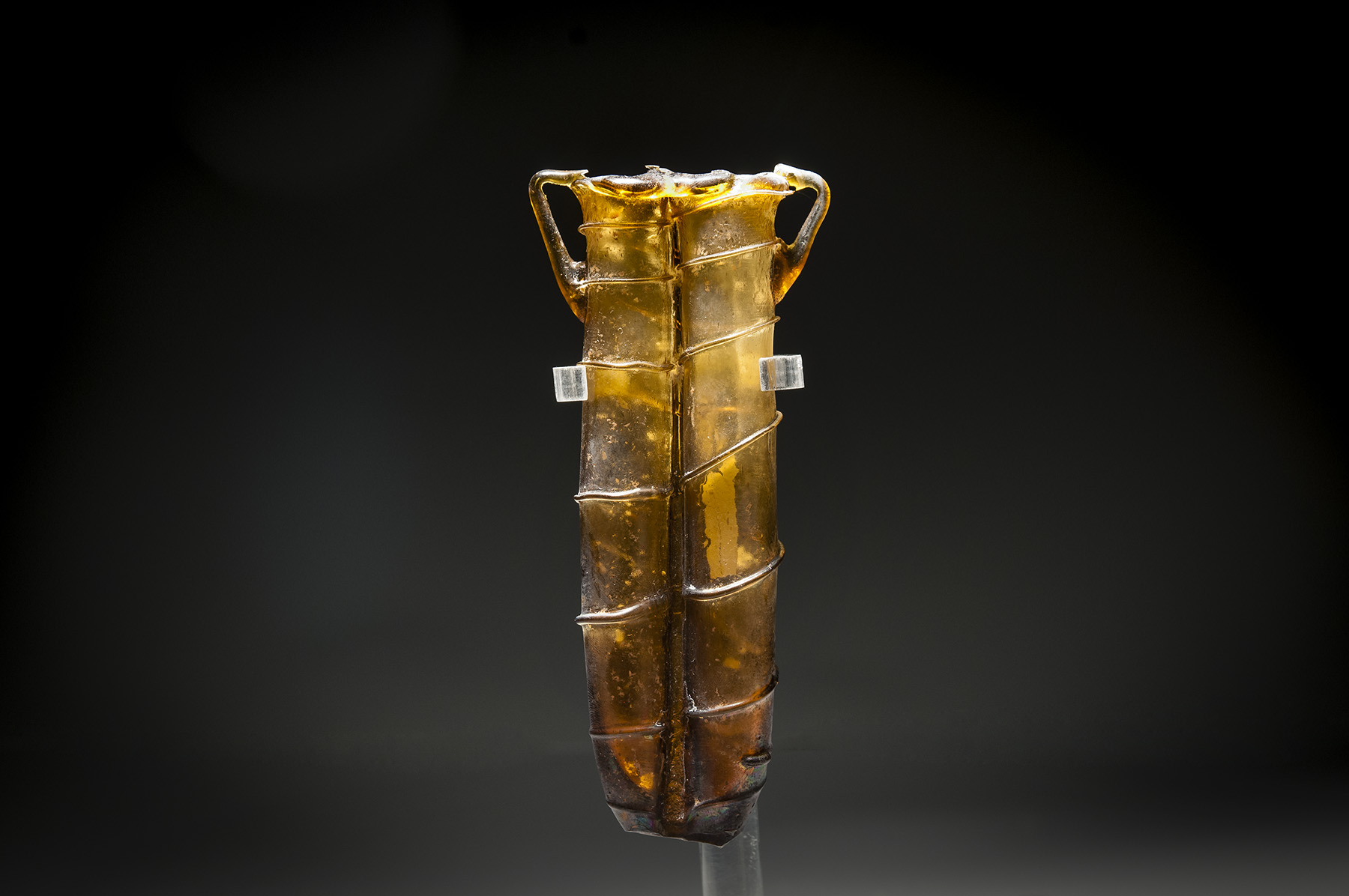 A Roman amber double ungeuntarium glass kohl flask with two handles